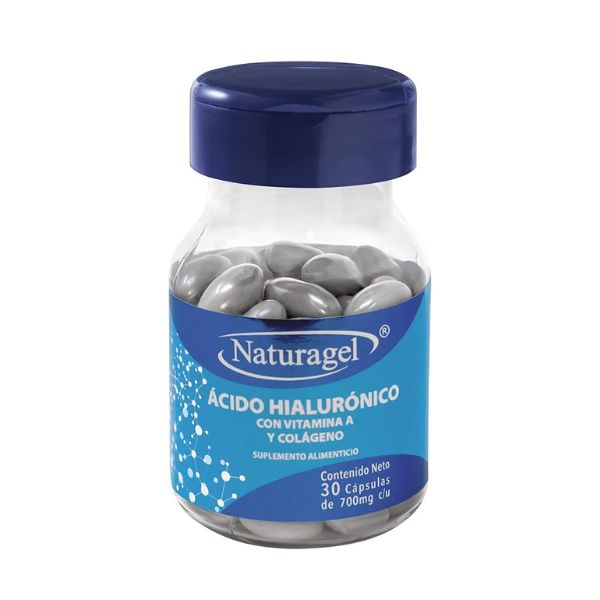El Ácido Hialurónico con Vitamina A y Colágeno de Naturagel es un suplemento en cápsulas que combina tres potentes ingredientes para promover la salud de la piel. Cada frasco contiene 30 cápsulas de 700 mg cada una. Esta fórmula única está diseñada para mejorar la hidratación, elasticidad y firmeza de la piel, brindando un aspecto más joven y radiante.