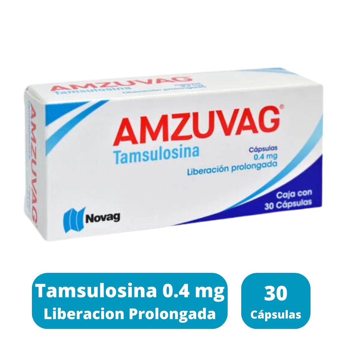 Amzuvag (Tamsulosina) 0.4 mg es un medicamento de Novag Laboratorios, presentado en cápsulas de liberación prolongada, diseñado específicamente para aliviar los síntomas de de ciertos padecimientos médicos. Cada caja contiene 30 cápsulas, formuladas para asegurar una administración controlada y efectiva del medicamento. Es fundamental consultar a un médico antes de comenzar el tratamiento y evitar la automedicación.