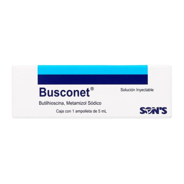 Busconet (Hioscina/Metamizol Sódico) 20 mg/5 ml es una ampolleta inyectable fabricada por Laboratorios Son's. Este medicamento combina la hioscina, un antiespasmódico, con el metamizol sódico, un analgésico y antipirético.