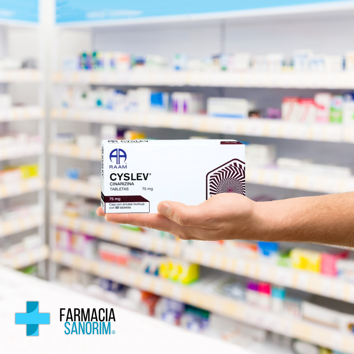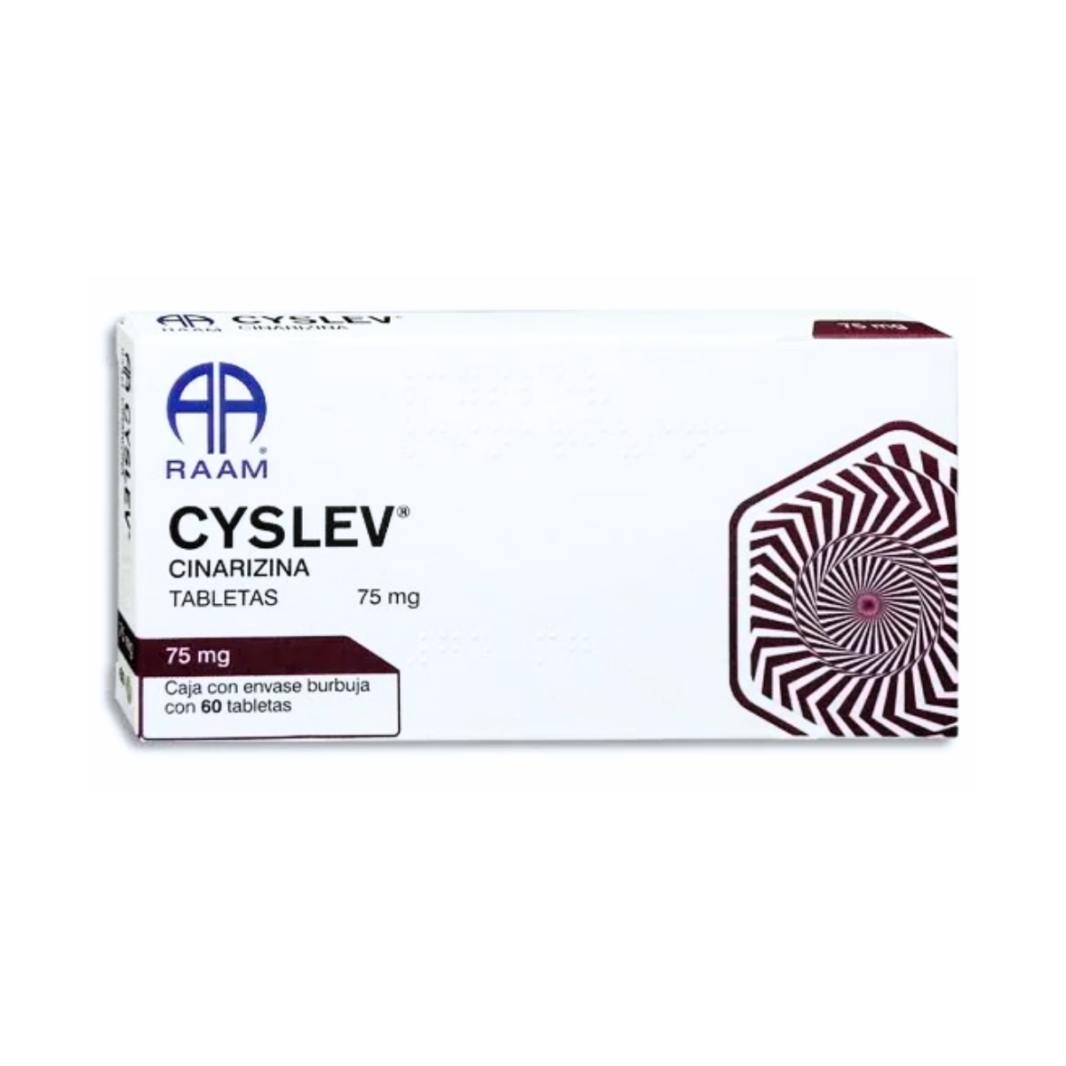 Cyslev es un medicamento fabricado por Laboratorio RAAM de Sahuayo, S.A. de C.V., que contiene Cinarizina 75 mg por tableta y se presenta en una caja con 60 tabletas. Esta fórmula actúa en el sistema vestibular y circulatorio, por lo que su uso está destinado a aliviar ciertos síntomas relacionados con el equilibrio y el flujo sanguíneo.