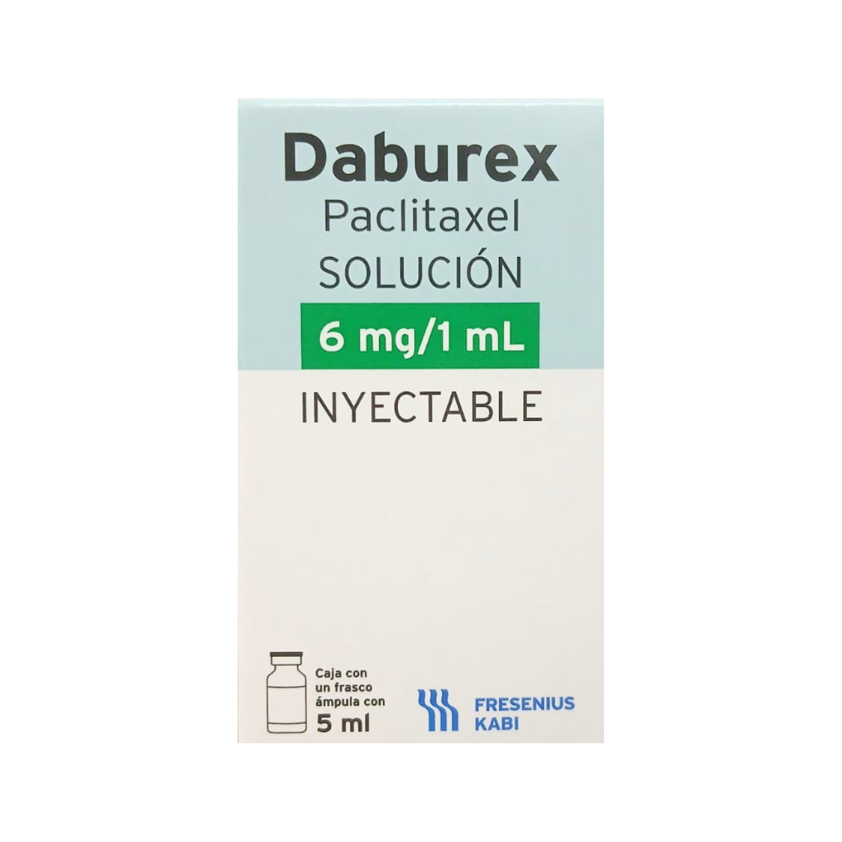 Daburex Paclitaxel 6 mg/1 mL es un medicamento oncológico utilizado en el tratamiento de varios tipos de cáncer, como el cáncer de mama, ovario, pulmón y otros. Viene en presentación de una caja que contiene una ampolla inyectable de 5 mL, lo que equivale a una dosis de 30 mg de paclitaxel.