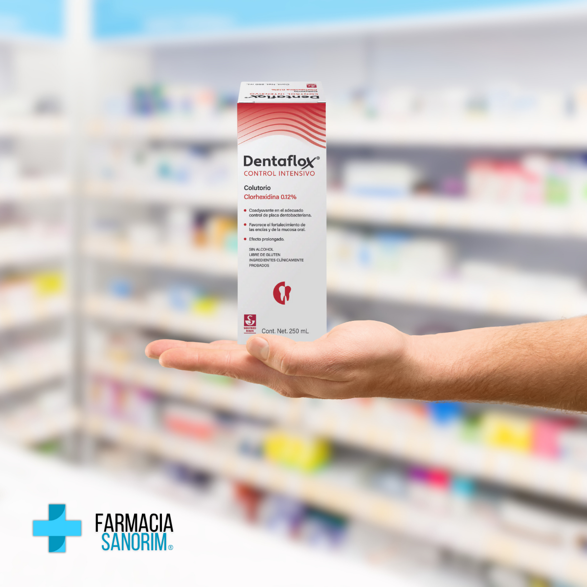 Dentaflox Control Intensivo es un enjuague bucal en presentación de frasco con 250 ml, formulado con clorhexidina al 0.12%, un agente antiséptico ampliamente utilizado para el cuidado y protección de encías y tejidos bucales.