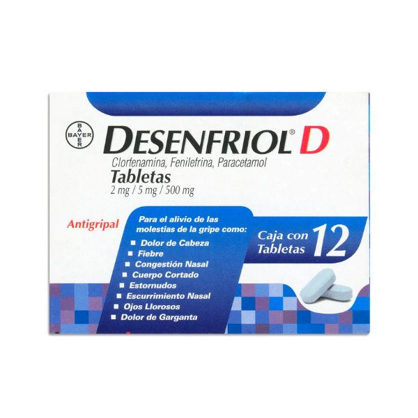 Desenfriol D es un medicamento desarrollado por Laboratorios Bayer, disponible en una caja con 12 cápsulas. Está diseñado para aliviar los síntomas del resfriado común y la gripe, como la congestión nasal, dolor de cabeza, fiebre y malestar general. La fórmula de Desenfriol D combina ingredientes como el paracetamol, la fenilefrina y la clorfenamina, que actúan en conjunto para proporcionar un alivio efectivo y rápido.
