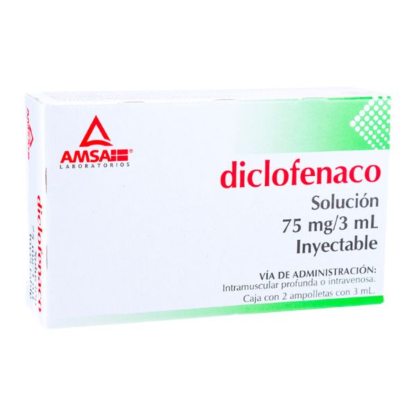 Diclofenaco 75 mg/3 ml de Laboratorios AMSA. Cada caja contiene 2 ampolletas cargadas con la potencia de Diclofenaco, un antiinflamatorio no esteroideo (AINE) reconocido.