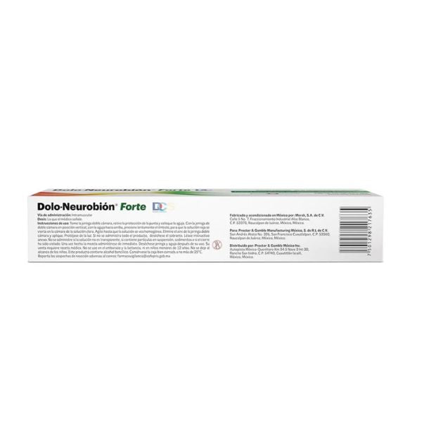 Dolo-Neurobión Forte DC es una solución inyectable en una jeringa prellenada de 3 ml fabricada por laboratorios Merck. Esta fórmula combina tres ingredientes activos: diclofenaco, complejo B y lidocaína. Se utiliza para aliviar el dolor moderado a severo, la inflamación y el malestar muscular, nervioso o articular. La presentación de la jeringa prellenada permite una fácil administración y dosificación precisa. Dolo-Neurobión Forte DC es un medicamento de venta bajo prescripción médica y debe ser utilizado únicamente bajo supervisión médica.