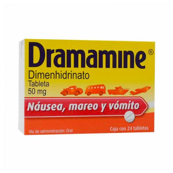 Dramamine (Dimenhidrinato) 50 mg es un medicamento utilizado para prevenir y aliviar los síntomas de mareo y náuseas causados por el movimiento, como el mareo en el viaje. Cada caja de Dramamine contiene 24 tabletas fabricadas por Laboratorios Janssen-Cilag. El dimenhidrinato es un antihistamínico que actúa sobre el sistema nervioso central para reducir las sensaciones de mareo y las náuseas asociadas.