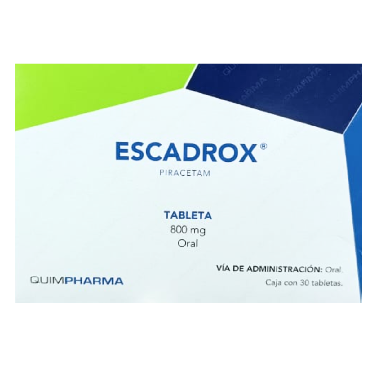Piracetam 800 mg Escadrox es un medicamento nootrópico presentado en una caja con 30 tabletas, utilizado principalmente para mejorar funciones cognitivas.