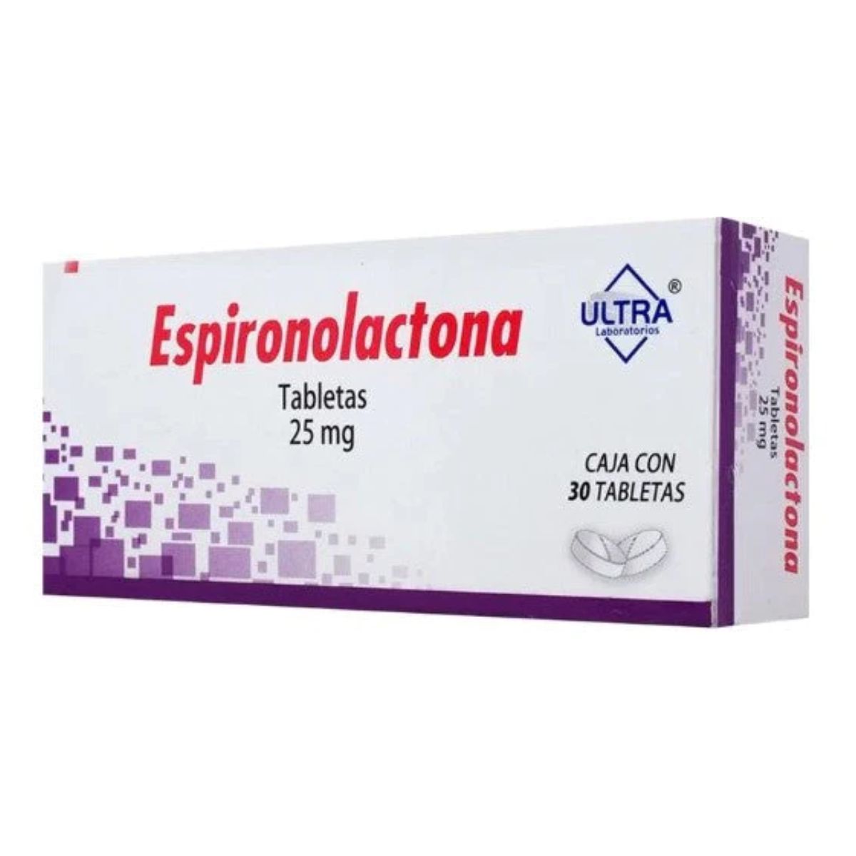 Espironolactona 25 mg es un medicamento diurético y antihipertensivo utilizado para tratar diversas condiciones de salud. Esta presentación en caja con 30 tabletas es fabricada por Ultra Laboratorios. La espironolactona 25 mg es comúnmente recetada para tratar la hipertensión arterial, la retención de líquidos causada por problemas cardíacos, la insuficiencia cardíaca congestiva y el síndrome de ovario poliquístico. Además, este medicamento puede ser útil en el tratamiento del acné resistente a otros tratamientos convencionales. La espironolactona 25 mg ayuda a eliminar el exceso de sal y agua del cuerpo, lo que contribuye a reducir la hinchazón y la presión arterial alta.