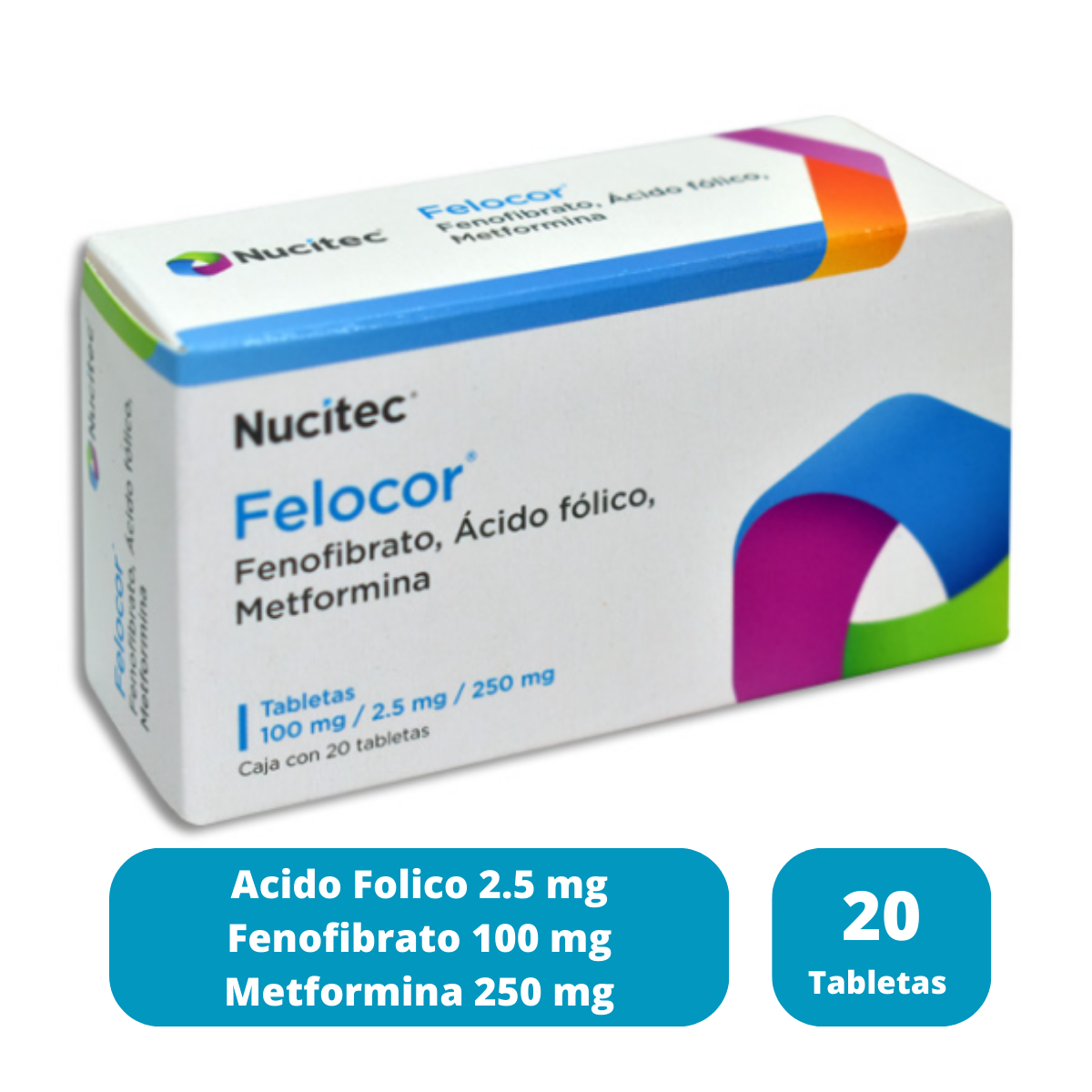 Felocor es un medicamento que combina tres principios activos: ácido fólico, fenofibrato y metformina. Está diseñado para tratar condiciones relacionadas con el metabolismo de lípidos y glucosa, además de suplementar ácido fólico.Este producto viene en una presentación de caja con 20 tabletas, y es fabricado por Laboratorios Nucitec. Su uso debe ser indicado y supervisado por un médico.