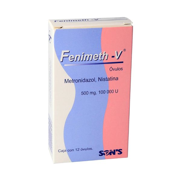 Fenmeth-V (Metronidazol/Nistatina) es un medicamento vaginal en forma de óvulos fabricado por Laboratorios Son's. Cada caja contiene 12 óvulos y está indicado para el tratamiento de infecciones vaginales, como la vaginosis bacteriana y la candidiasis vaginal.