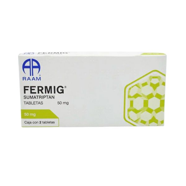 Fermig (Sumatriptan) 50 mg es un medicamento utilizado para el tratamiento de la migraña y los dolores de cabeza intensos. Cada caja de Fermig contiene 2 tabletas fabricadas por Laboratorios RAAM. Este medicamento está formulado para proporcionar alivio rápido y efectivo de los síntomas de la migraña, como el dolor de cabeza, la sensibilidad a la luz y el sonido, y las náuseas.