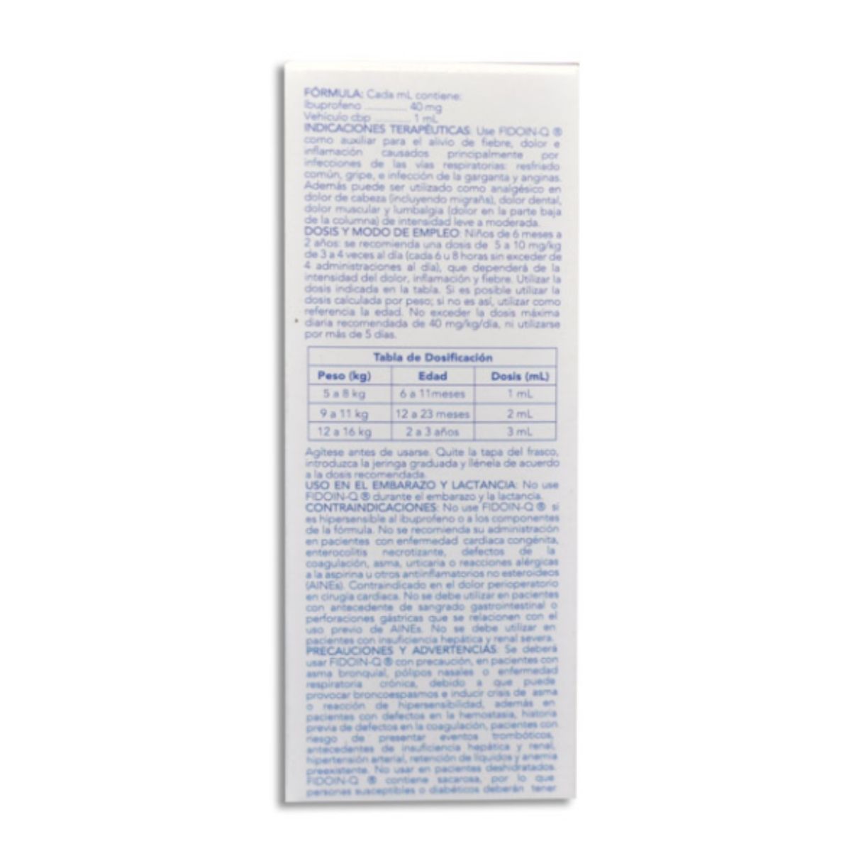 Ibuprofeno 2g/100 mL Suspensión Infantil de la marca Fidoin Q es un medicamento en presentación líquida, especialmente formulado para niños. Cada frasco contiene 120 mL de una suspensión con sabor Tutti Fruti, lo que facilita la administración del medicamento a los más pequeños.