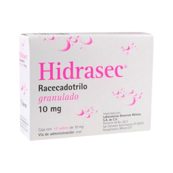 Hidrasec (Rececadotrilo) es un medicamento en presentación de sobres granulados de 10 mg, disponible en caja con 18 sobres, fabricado por Laboratorios Ferrer. Está indicado principalmente para el tratamiento de la diarrea, ya que actúa favoreciendo la absorción de electrolitos y agua en el intestino, lo cual contribuye a la normalización de las deposiciones. Es importante consultar a un médico antes de su uso para asegurar su adecuación y dosificación correcta según el caso particular del paciente,
