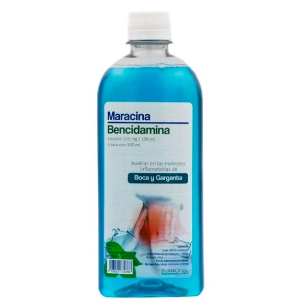 Maracina (Bencidamina) Solución 150 mg/100 ml Frasco con 360 ml de Laboratorios Suanca es un medicamento antiinflamatorio y analgésico que se utiliza para tratar afecciones de la garganta y la boca, como la gingivitis, la faringitis y la amigdalitis. Su presentación en un frasco de 360 ml funciona aliviando el dolor y reduciendo la inflamación de forma efectiva. Beniflant es una opción confiable y de alta calidad para el cuidado de la salud bucal. Como cualquier medicamento, se recomienda seguir las instrucciones del médico o farmacéutico y leer cuidadosamente la información del producto antes de su uso.