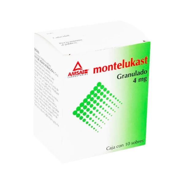 Montelukast 4 mg Granulado es un medicamento desarrollado por Laboratorios AMSA que se presenta en una caja con 10 sobres. Este fármaco es utilizado para el tratamiento de condiciones respiratorias como el asma y la rinitis alérgica. El Montelukast actúa como un bloqueador de los receptores de los leucotrienos, reduciendo la inflamación y la constricción de las vías respiratorias, lo que ayuda a controlar los síntomas y mejorar la calidad de vida de los pacientes.