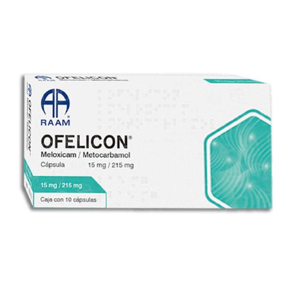 Ofelicon es un medicamento fabricado por Laboratorios RAAM que contiene una combinación de Meloxicam y Metocarbamol. Este fármaco se presenta en forma de cápsulas y se utiliza para el alivio del dolor y la inflamación asociados con condiciones como artritis, espondilitis anquilosante y lesiones musculoesqueléticas. La presentación del medicamento es en una caja con 10 cápsulas y cada una contiene 15 mg de Meloxicam y 215 mg de Metocarbamol. Consulte a su médico para cualquier información y consumo referente a este medicamento.