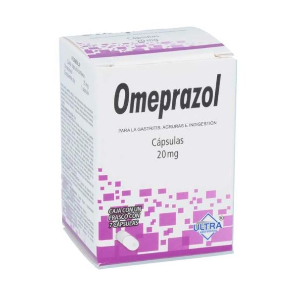 Omeprazol 20 mg es un medicamento utilizado para el alivio de los síntomas de la acidez estomacal y el reflujo ácido. Esta presentación de Ultra Laboratorios viene en una caja con 7 tabletas. El omeprazol pertenece a la clase de medicamentos conocidos como inhibidores de la bomba de protones, los cuales reducen la producción de ácido en el estómago.