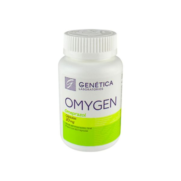 Omygen (Omeprazol) 20 mg es un medicamento utilizado para el tratamiento de afecciones relacionadas con la acidez estomacal, como la enfermedad por reflujo gastroesofágico (ERGE) y las úlceras gástricas. Esta presentación de Omygen, en una caja con 60 cápsulas, es fabricada por Genética Laboratorios. El omeprazol es un inhibidor de la bomba de protones que ayuda a reducir la producción de ácido en el estómago, aliviando los síntomas asociados con el exceso de acidez.
