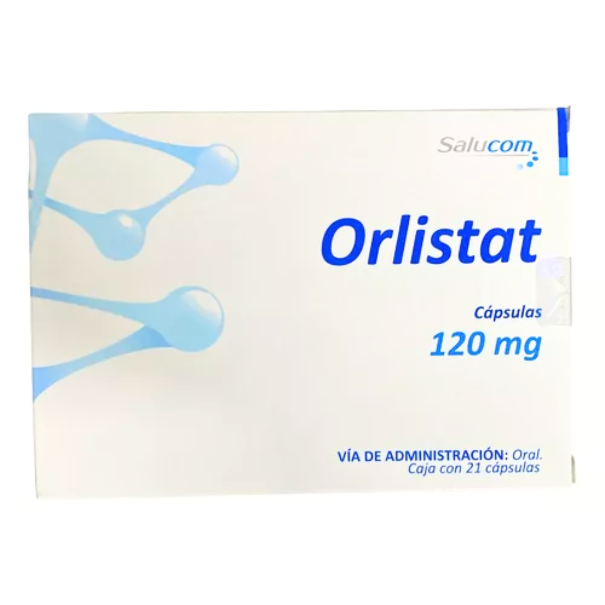 El orlistat es un fármaco para tratar la obesidad mediante reduciendo la absorción de la grasa contenida en los alimentos al inhibir la hidrólisis de los triglicéridos, aumentando su eliminación por las heces en un 30%. Este medicamento debe de ser prescrito por un médico. Orlistat de 120 mg cada caja contiene 21 tabletas.
