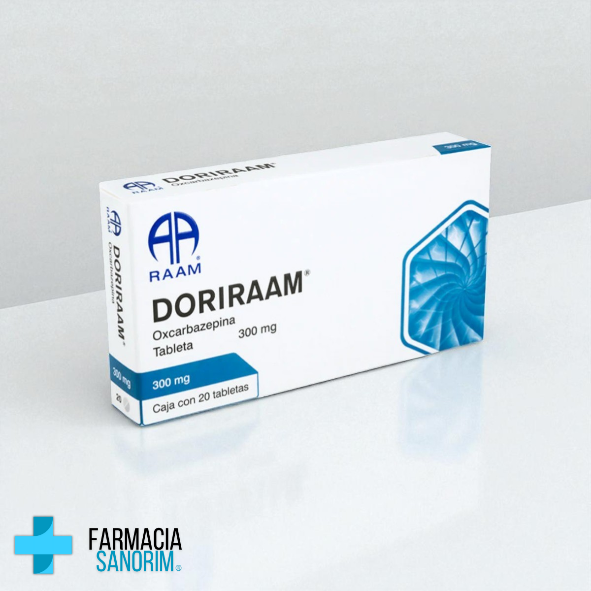 Oxcarbazepina 300 mg, caja con 20 tabletas (Doriraam RAAM) es un medicamento anticonvulsivante utilizado bajo prescripción médica.