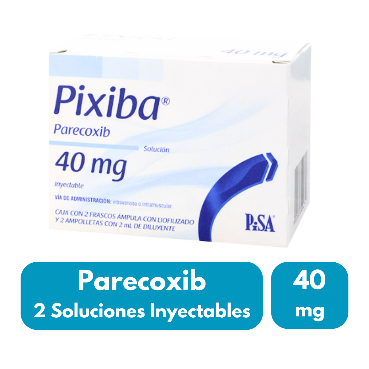 Presentación en forma inyectable con 2 frascos, formulados con 40 mg de parecoxib cada uno. Pixiba es un producto farmacéutico de uso hospitalario y especializado, perteneciente a la línea de manejo del dolor, elaborado bajo estrictos estándares de calidad. Su formulación permite una preparación y administración controlada conforme a la indicación del profesional de la salud.