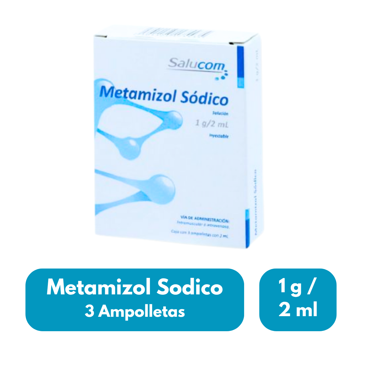 Presentación con 3 ampolletas de 2 ml cada una, elaboradas por Laboratorios Pisa bajo la marca Salucom. Contiene metamizol sódico 1 g por cada 2 ml de solución inyectable. Producto perteneciente a la línea de medicamentos de uso hospitalario, desarrollado con los estándares de calidad y seguridad que distinguen al laboratorio. Su formato en ampolletas permite un manejo práctico y confiable.