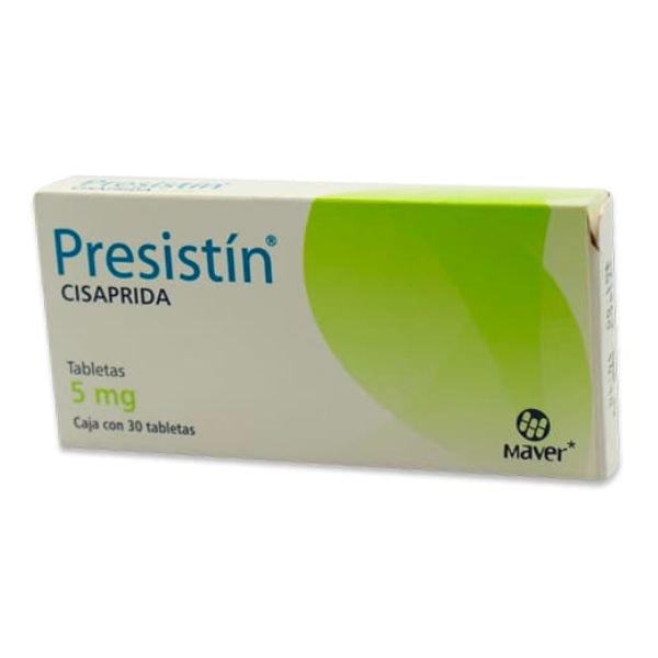 Presistín (cisaprida) 5 mg es un medicamento fabricado por Laboratorios Maver que se presenta en una caja con 30 tabletas. La cisaprida es un agente proquinético utilizado para el tratamiento de trastornos gastrointestinales como la dispepsia, el reflujo gastroesofágico y la gastroparesia.