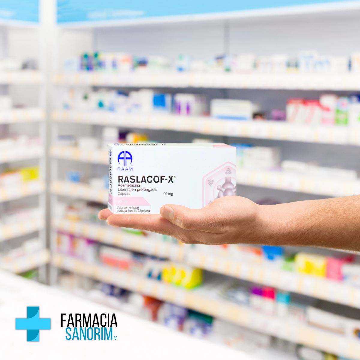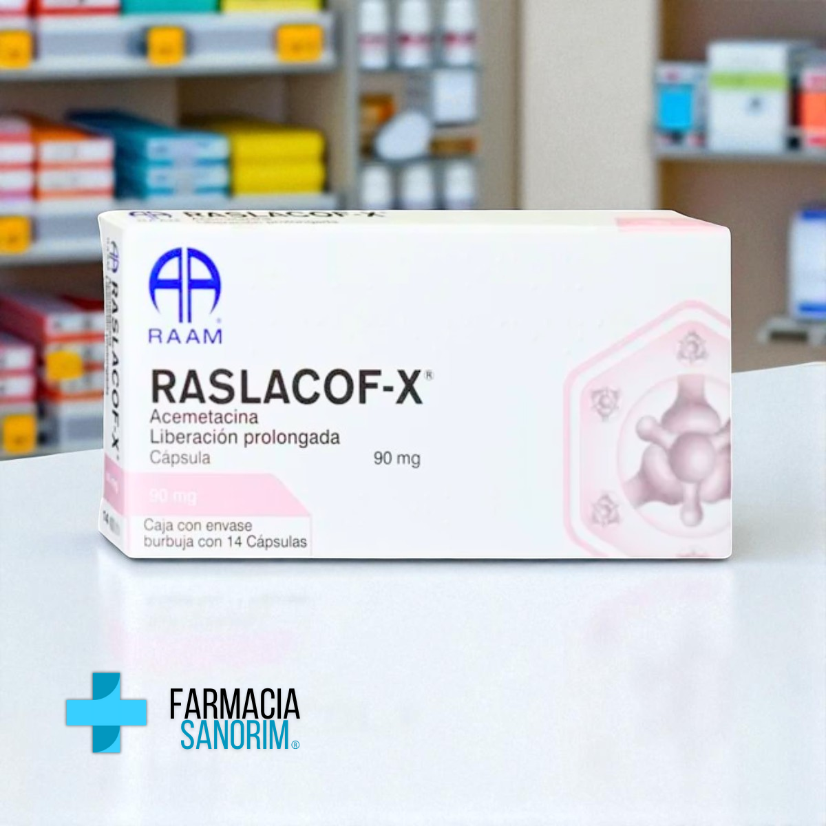 Raslacof-X es un producto desarrollado por RAAM Laboratorios, que contiene Acemetacina 90 mg por cápsula. Esta presentación cuenta con una fórmula de liberación prolongada, diseñada para ofrecer un efecto sostenido durante el día, lo que puede reducir la frecuencia de administración.