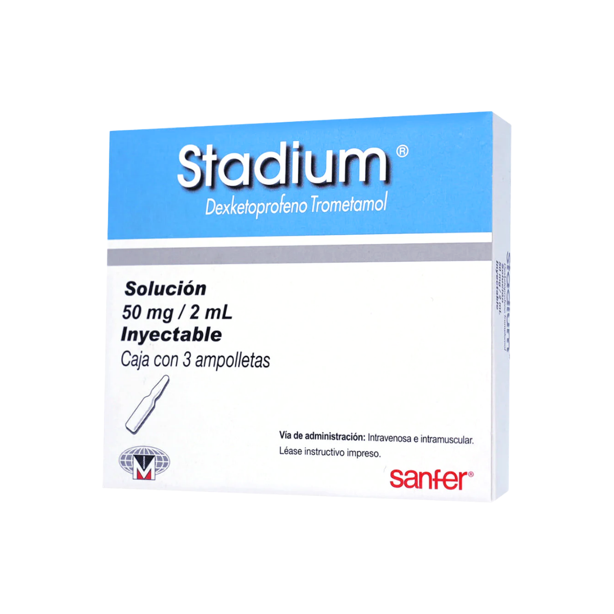 Presentación con 3 ampolletas de 2 ml cada una, elaboradas por Laboratorios Sanfer bajo la marca Stadium. Cada ampolleta contiene 50 mg de dexketoprofeno en solución inyectable, formulada bajo estándares de calidad farmacéutica. Producto de uso especializado, diseñado para manejo profesional, respaldado por un laboratorio con experiencia en el sector.