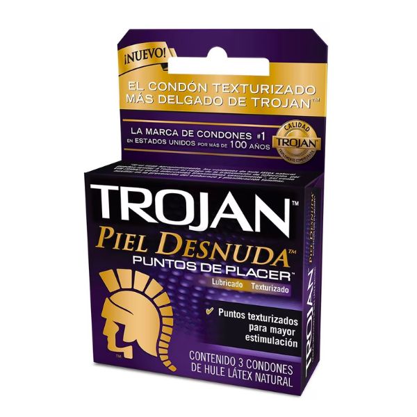 Trojan Piel Desnuda Puntos de Placer son preservativos masculinos fabricados por Laboratorios Church & Dwight. Esta caja contiene 3 preservativos diseñados para brindar una experiencia íntima y placentera.