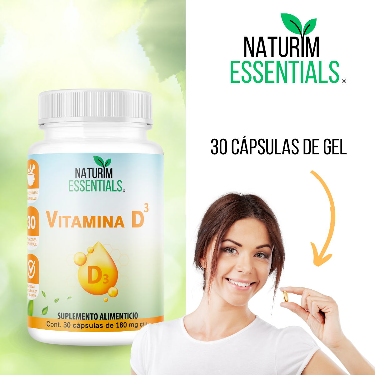Introducimos Naturim Essentials, un suplemento alimenticio de alta calidad diseñado para potenciar tu bienestar y mejorar tu salud ósea y inmunológica. Nuestra fórmula de Vitamina D3 ha sido cuidadosamente desarrollada para brindarte los beneficios esenciales de esta vitamina vital en cada cápsula.